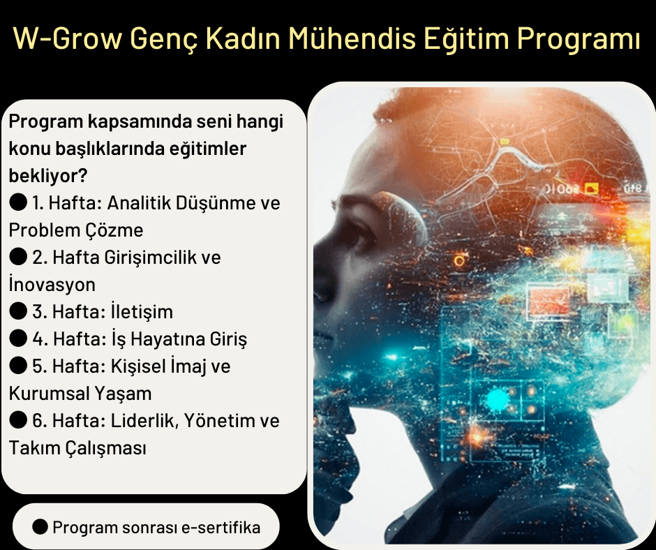 W-Grow Genç Kadın Mühendis Eğitim Programı sizi eni yeni nesil konu başlıkları altında farklı alanlardaki eğitimlerle kendinizi geliştireceğiniz 6 haftalık eğitim ve gelişim programına davet ediyor!