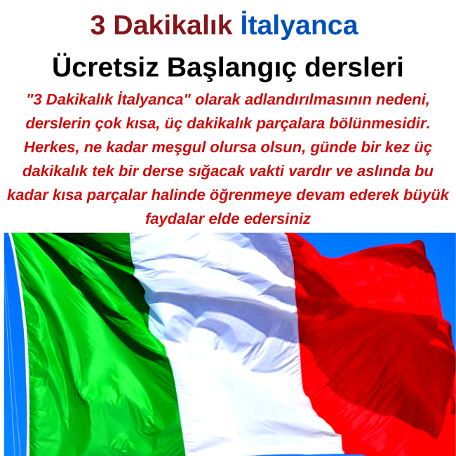 Daha önce hiç İtalyanca öğrenmediyseniz veya bu güzel dili öğrenmekle ilgili kötü bir deneyim yaşadıysanız, 3 Dakikalık İtalyanca dersleri başarılı olmanıza yardımcı olacaktır.