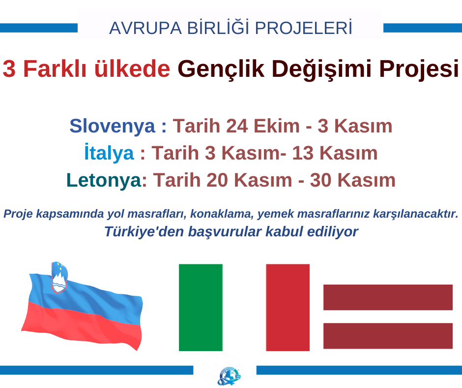 3 farklı ülkede yapılacak gençlik değişimi projesine başvuru yapabilirsiniz.