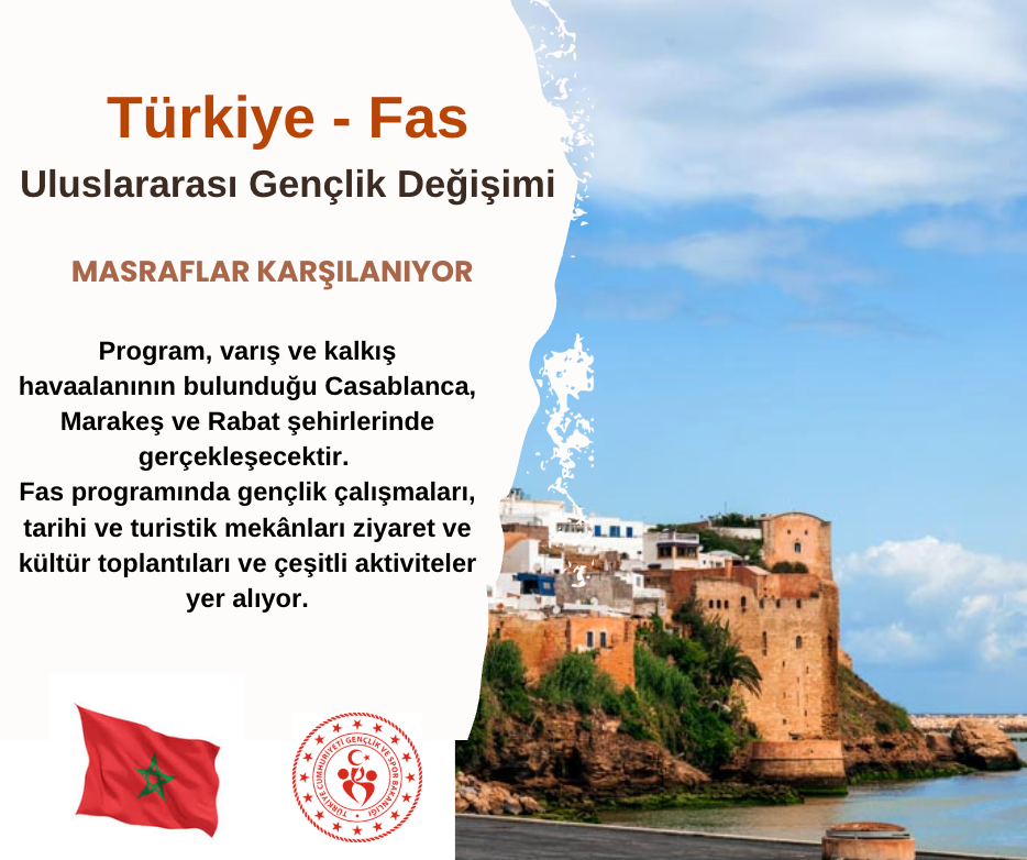 Türkiye ile Fas arasındaki dostluğu pekiştirmek, gençler arasındaki etkileşimi artırmak ve kültürel iş birliğini güçlendirmek amacıyla uluslararası gençlik değişimi programı düzenleniyor.