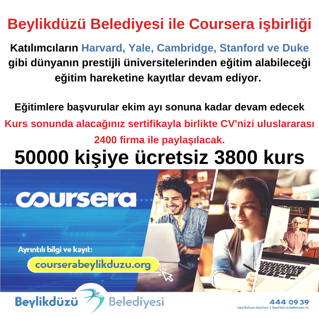 Beylikdüzü Belediyesi’nin , online eğitim platformu Coursera ile 23 Eylül tarihinde Türkiye’yi kapsayacak şekilde eğitim hareketini başlatmıştır.