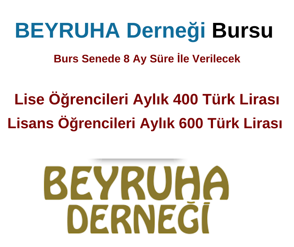 BEYRUHA DERNEĞİ’nin vereceği bursun amacı ise bursa ihtiyaç duyan başarılı öğrencilere eğitim öğretim dönemi süresince başarılı bir şekilde bitirmelerine destek vermektir.