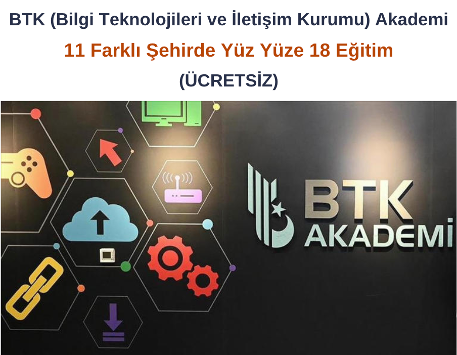 Bilgi Teknolojileri ve İletişim Kurumu (BTK), BTK Akademi aracılığıyla, Türkiye’nin 11 şehrinde 18 farklı branşta ücretsiz olarak yüz yüze eğitim sunacak.