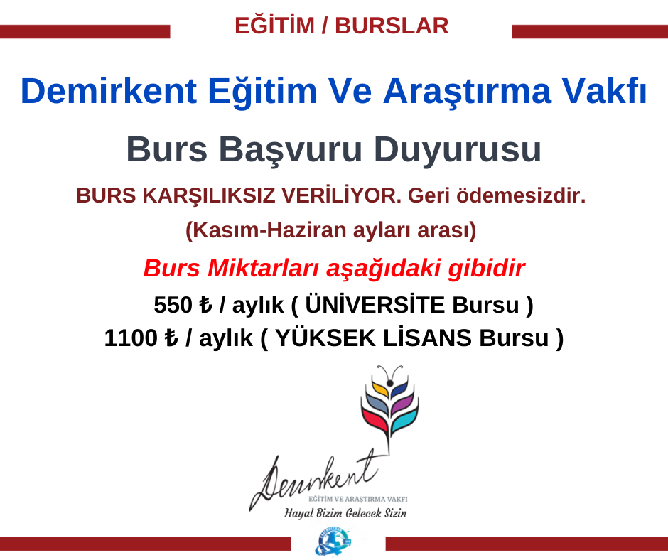 Demirkent Eğitim Ve Araştırma Vakfı’nın duyurusunu yaptığı burs duyurusu ile başvurular başlamıştır.
