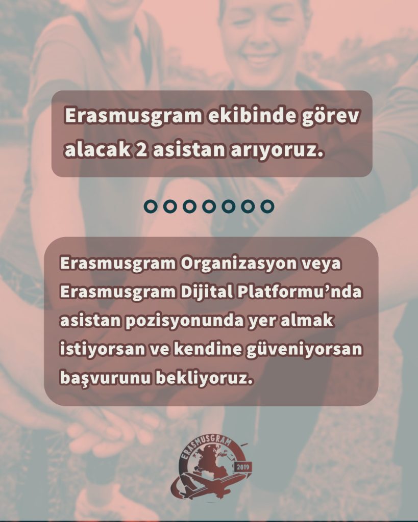 Dijital platformda, ( Instagram, Telegram, Erasmusgram TV Youtube Kanalı , Erasmusgram web sitesi) yaptığımız paylaşımlar konusunda bizimle birlikte sistemin içerisindeki düzen konusunda destek sağlanması, fikir geliştirilmesi , raporlama yapılması , sürekli olarak iletişim halinde olacak ve dijital becerileri kuvvetli Dijial Platform Asistanlığı yapacak ekip arkadaşı arıyoruz.