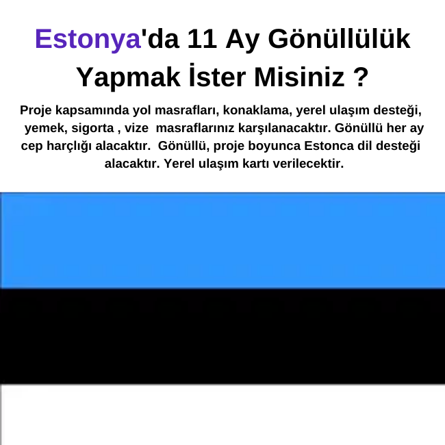 Proje kapsamında yol masrafları, konaklama, yerel ulaşım desteği, yemek, sigorta , vize masraflarınız karşılanacaktır. Gönüllü her ay cep harçlığı alacaktır. Gönüllü, proje boyunca Estonca dil desteği alacaktır. Yerel ulaşım kartı verilecektir.