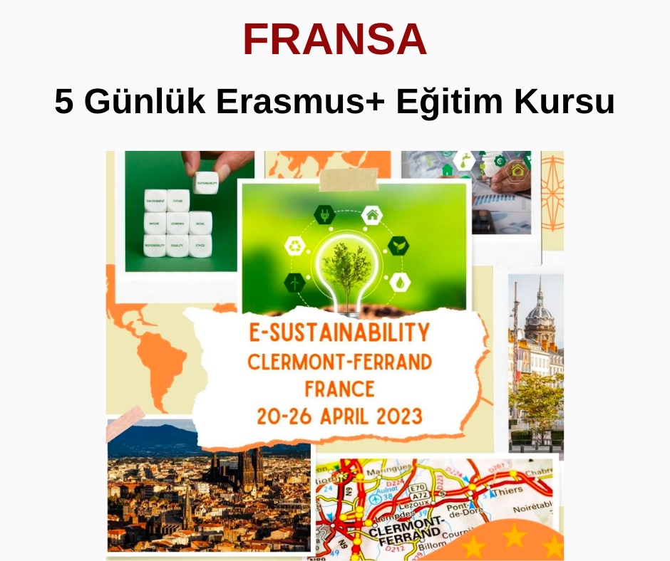 20-26 Nisan 2023’te Clermont Ferrand Fransa’da gerçekleştirilecek olan e-Sustainability Erasmus+ Eğitim Kursuna katılacak 2 katılımcı aranıyor