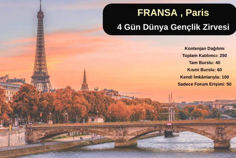 Youth World Summit 2026 için başvurular resmen başladı. 11–14 Haziran 2026 tarihleri arasında Fransa’nın Paris kentinde gerçekleştirilecek bu tam burslu uluslararası gençlik zirvesi, gençleri küresel politikalar, liderlik, barış ve sürdürülebilir kalkınma konularında bir araya getirmeyi hedefliyor.