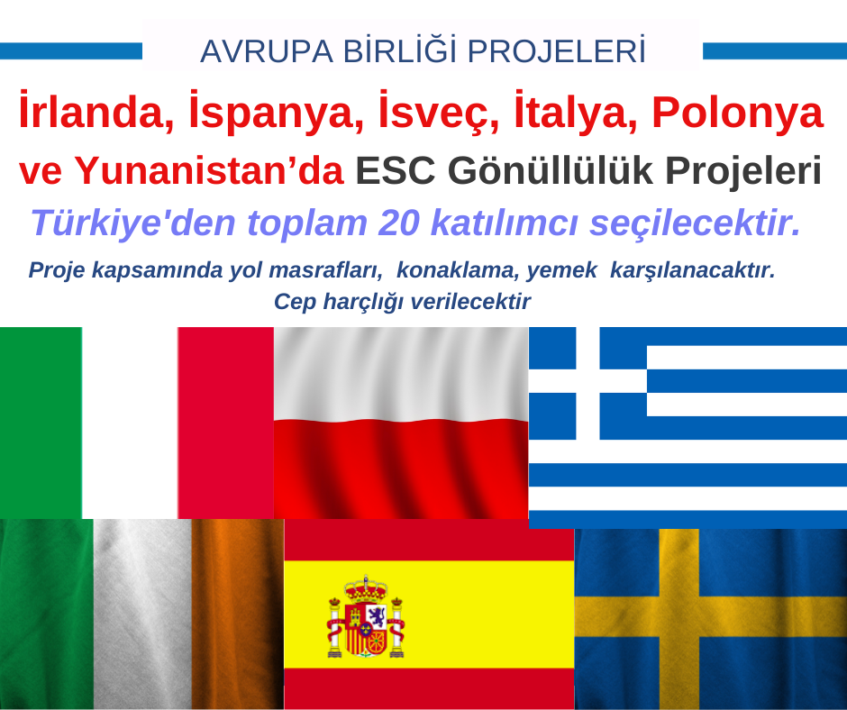 Gençleri Geleceğe Hazırlama ve İşsizlikle Mücadele Derneği (GEHİM-DER), Avrupa Birliği’nin finanse ettiği ESC Programı (Avrupa Dayanışma Programı) ile İrlanda, İspanya, İsveç, İtalya, Polonya ve Yunanistan’da gerçekleşecek projeler için katılımcı çağrısına çıktı!