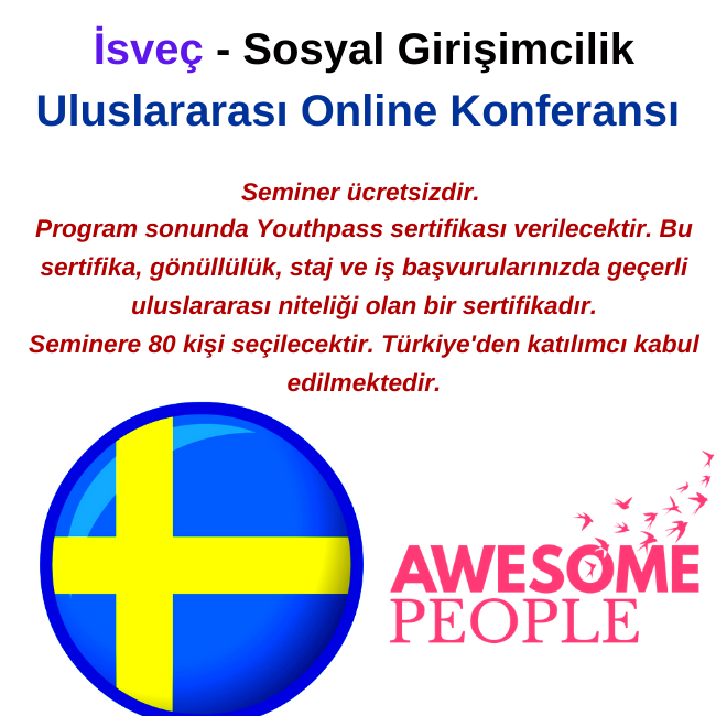 Bu etkinlik, Awesome People (İsveç), Un strop de fericire (Romanya) ve Nuorten Yrittäjyystalo Innola (Finlandiya) arasında üç yıllık bir işbirliği olan Pay it Forward Be A Social Entrepreneur International stratejik ortaklığının bir parçasıdır. Etkinlik, resmi olmayan öğrenme ve gençlik çalışmaları alanında çalışan 13-30 yaş arası gençlerle çalışan gençlik çalışanları, gençlik liderleri ve eğitimciler içindir. Bu çevrimiçi yayma konferansında, stratejik ortaklıkta geliştirdiğimiz ve test ettiğimiz sosyal girişimcilik faaliyetlerine (PiFbase) yeterince temsil edilmeyen genç gruplarını dahil etmek için yenilikçi bir yöntem hakkında bilgi edineceksiniz. Ayrıca, projede aşağıdaki temalar üzerine somut araç takımları, el kitapları, oyun ve daha pek çok şeyle tanışacaksınız: