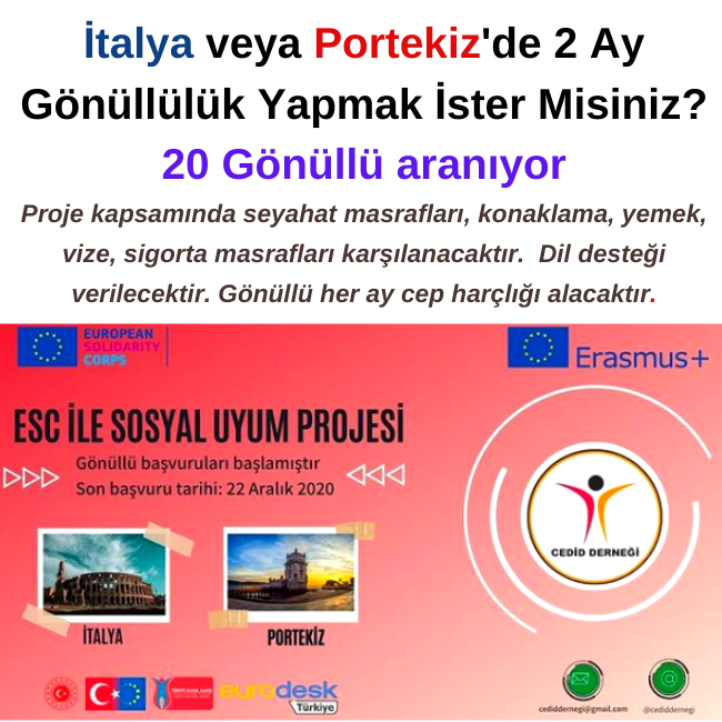 ” ESC ile Sosyal Uyum ” Projesi kapsamında Portekiz ve İtalya ülkelerinde gerçekleşecek projeye toplam da 20 gönüllü dâhil edilecektir.