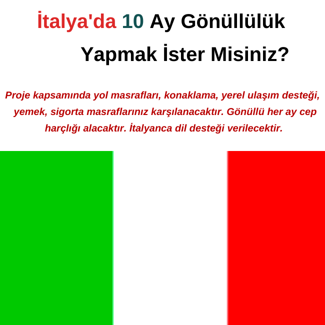 Proje kapsamında seyahat masrafları, konaklama, yerel ulaşım desteği, yemek, sigorta karşılanacaktır. Gönüllü her ay cep harçlığı alacaktır. Gönüllü, proje boyunca İtalyanca dil desteği alacaktır