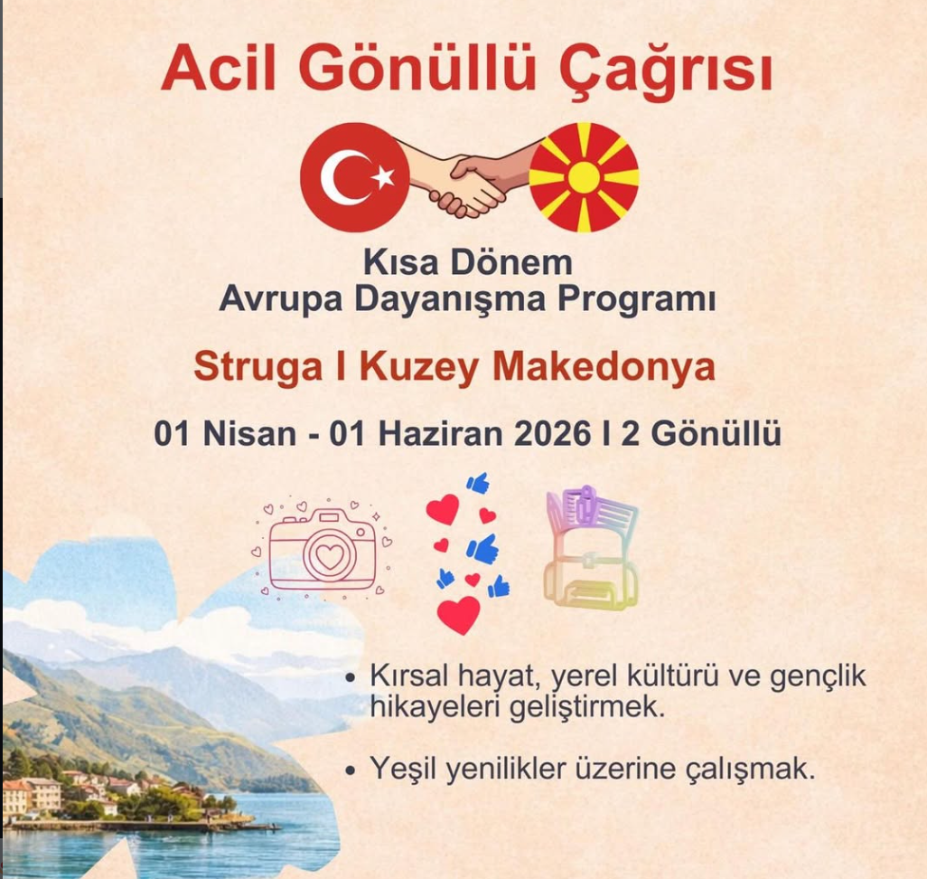 01.04.2026 – 01.06.2026 tarihleri arasında gerçekleşecek bu projede 2 gönüllü yer alacaktır.