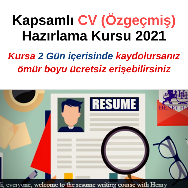 Size özgeçmiş yazma sanatı hakkında derinlemesine bilgi verecek eksiksiz ve kapsamlı bir kurstur. Kariyerinize küçük bir yatırım yapıyorsanız, bu kurs kariyerinizi yeni zirvelere taşıyacağından ve en etkili şekilde iyi bir iş aramaya başlayabileceğiniz için uzun vadede verimli olacaktır.