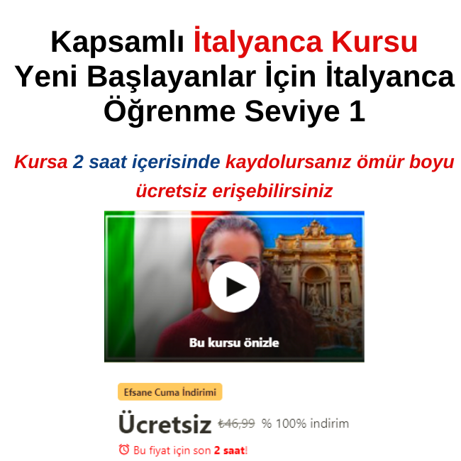 Tüm bunlar ve daha fazlası sadece birkaç saatlik eğitimde! Bu kurs, İtalyanca’nın temellerini öğrenmenize yardımcı olmayı ve size bir İtalyanca konuşmacı olarak becerilerinizi geliştirebileceğiniz güçlü bir temel sağlamayı amaçlayan bir serinin ilkidir.