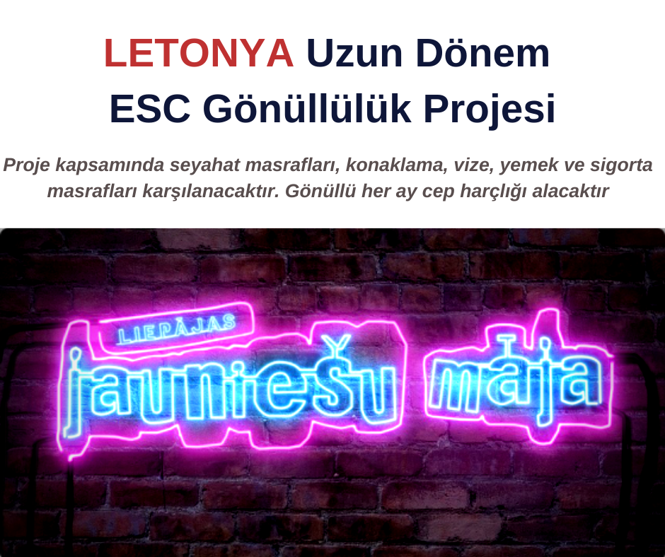 Proje kapsamında yol masrafları, konaklama, yerel ulaşım desteği, yemek, sigorta , vize masraflarınız karşılanacaktır. Gönüllü her ay cep harçlığı alacaktır. Gönüllü, proje boyunca Letonca dil desteği alacaktır