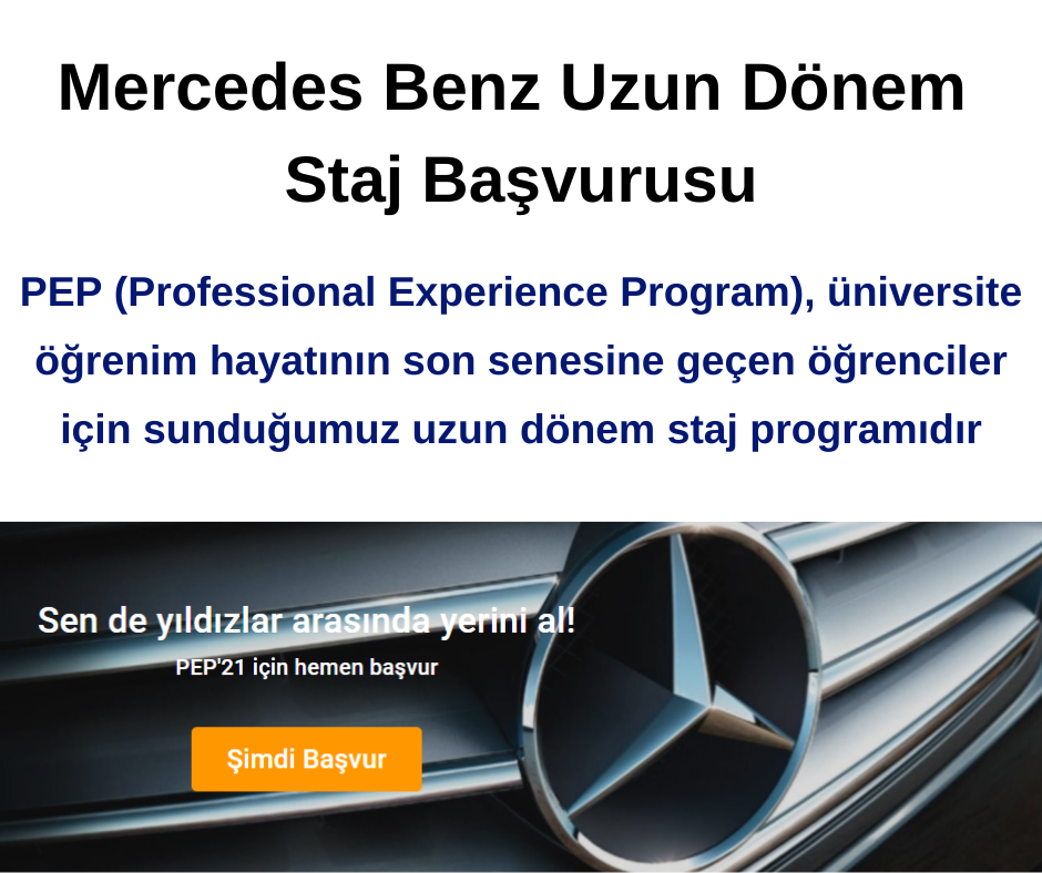 PEP (Professional Experience Program) Uzun Dönem Staj Programına ilgili olan kişiler stajyerlerin tecrübelerini kendilerinden dinlemek isterseniz https://anlatsin.com/mercedesbenz linkinden erişebilirsiniz.