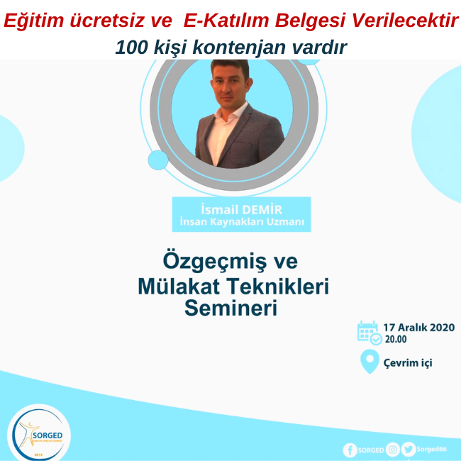 Sorgun Gençlik Derneği’nin organize ettiği , 17 Aralık 2020 ‘de online olarak gerçekleşecek olan “Özgeçmiş ve Mülakat Teknikleri Semineri” düzenleniyor.