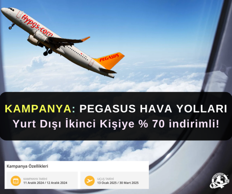 Biletlerinizi Kampanya’nın geçerli olduğu satış ve uçuş tarihlerinde Pegasus İnternet Sitesi (flypgs.com) ve Pegasus Mobil Uygulamasından alarak, 13 Ocak 2025 – 30 Mart 2025 arasında biletinizdeki ikinci Pegasus BolBollu kişi vergiler hariç %70 indirimle yurt dışına uçsun!