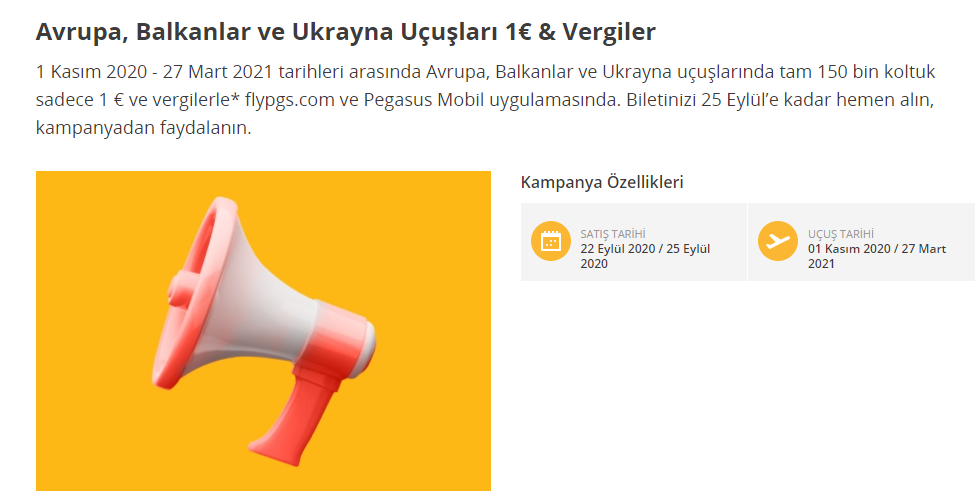 1 Kasım 2020 – 27 Mart 2021 tarih aralığında Avrupa, Balkanlar ve Ukrayna uçuşları için tam 150 bin koltuk sadece 1 € ve vergiler ile flypgs.com ve Pegasus Mobil uygulamasında.