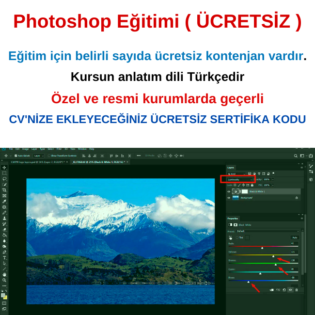 Fotoğrafların ve tasarımlardaki renklerin değiştirilmesini, siyah beyaz fotoğrafların yapılmasını öğreneceksiniz.