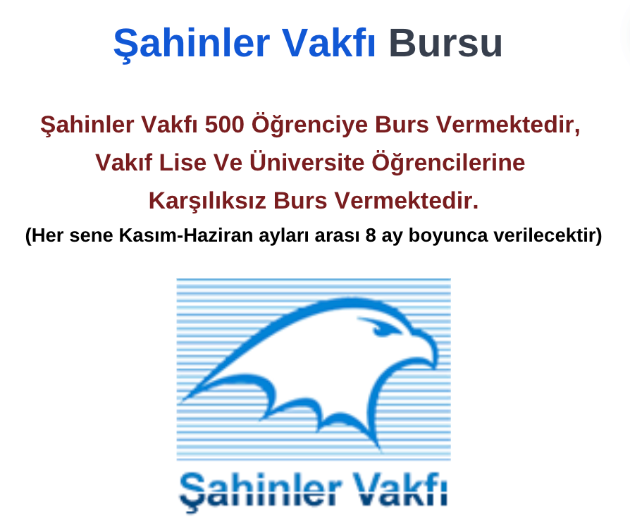 Şahinler Vakfı, 500 öğrenciye burs sağlamaktadır. Burs başvuruları, başvuru formu ve aşağıda belirtilen belgelerin kargo yoluyla teslim edilmesiyle yapılacaktır. Vakıf, lise ve üniversite öğrencilerine karşılıksız burs vermektedir.