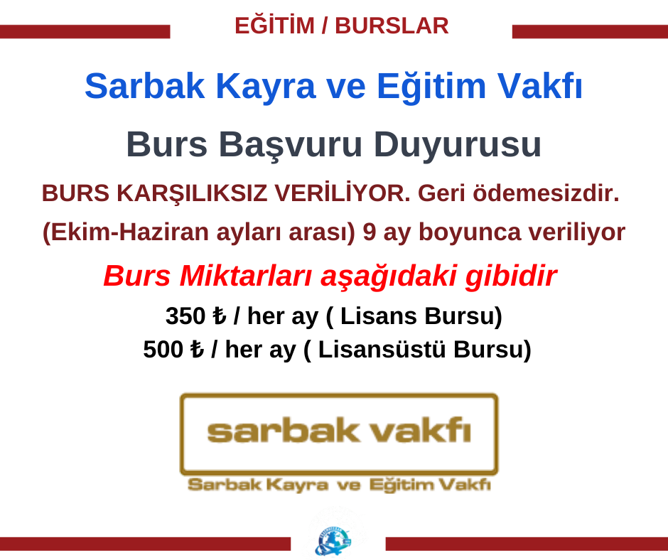 Sarbak Kayra ve Eğitim Vakfı Lisans ve Lisansüstü seviyesinde eğitimi alan başarılı ve maddi ihtiyacı olan öğrencilere burs veriyor.