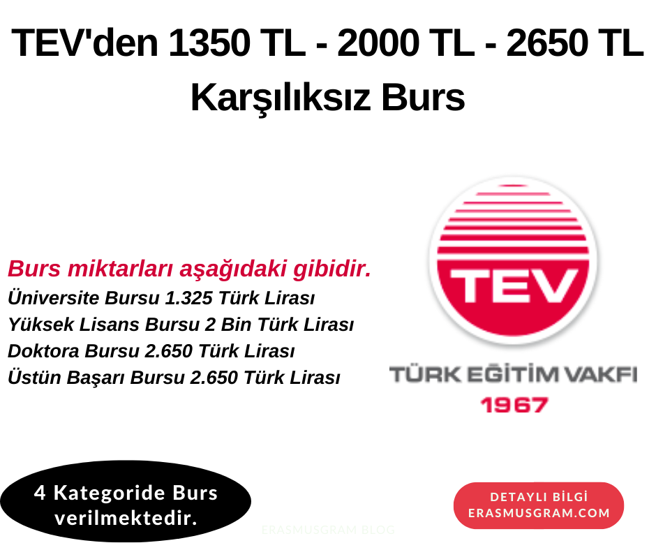 TEV Yüksek Lisans ve Doktora Bursu: Yüksek Lisans ve Doktora öğrencilerine yönelik verilen karşılıksız burslardır.