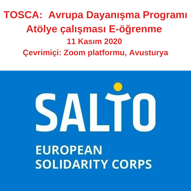 TOSCA: Avrupa Dayanışma Programı’nın değişen zamanlarda gönüllü projeleri üzerine Online Atölye çalışması E-öğrenme 11 Kasım 2020 | Çevrimiçi: Zoom platformu, Avusturya