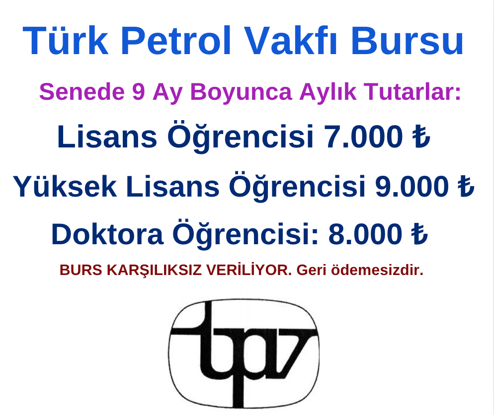 Türk Petrol Vakfı, lisans, yüksek lisans ve doktora düzeyinde eğitim gören öğrencilere geri ödemesiz burs imkânı sunmaktadır.