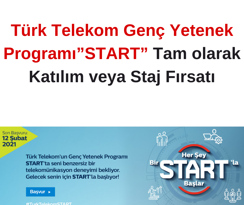Köklü geçmişi ile bilinen telekomünikasyon sektöründe lider olan Türk Telekom, Genç Yetenek Programı START ile katılım sağlayabilir ve Türk Telekom sürekli olarak kendisini yenileyerek dinamik, sürekli öğrenmek ve uzaktan çalışma fırsatıyla yerinizi alabilirsiniz.