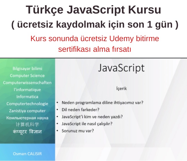 Bu ücretsiz kurs serisi ile mevcut olan en yeni teknolojiler kullanılacak ve Akademik ve pratik çalışmalar derlenerek JavaScript eğitimini alacaksınız. Bu kurs serisinde sadece JavaScript ile sınırlı kalmayarak, programlama temelleri ile ilgili bilgiler bulabileceksiniz. Bu kurs ile çok fazla quizler ve pratik sınavları sizi bekler.