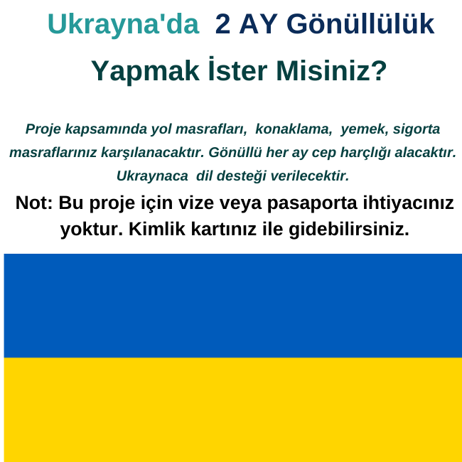 Proje kapsamında yol masrafları, konaklama, yemek, sigorta masrafları karşılanacaktır. Gönüllü her ay cep harçlığı alacaktır. Gönüllü, proje boyunca Ukraynaca dil desteği alacaktır