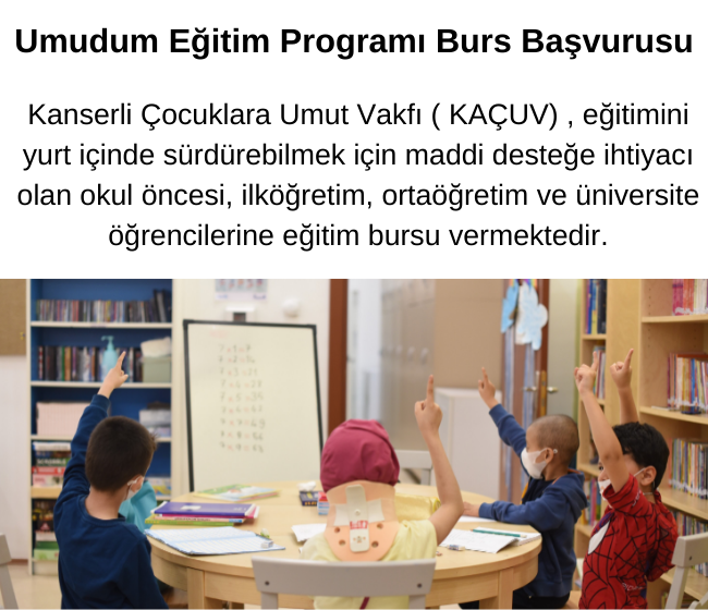 Kanserli Çocuklara Umut Vakfı ( KAÇUV) , eğitim hayatını Türkiye’de sürdürmesi için maddi destek ihtiyacına sahip okul öncesi , ilköğretimine , ortaöğretime ve üniversite öğrencileri için eğitim bursu verecektir.