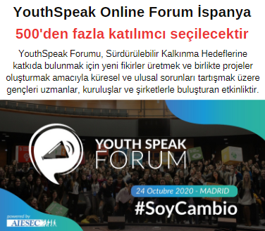 YouthSpeak Forumu, dünya genelde 100′ den fazla ülkede gerçekleşecek bir etkinliktir. Birleşmiş Milletler 2030 Gündeminde Sürdürülebilir Kalkınma Hedefleri için (SDG) katkıda bulunması için eyleme geçirmek ve yeni fikirleri üretmeyi amaçlayan küresel ve ulusal problemleri tartışmayı ve gençler, uzmanlar ve şirketler ile bir araya getirmeyi amaçlıyor.