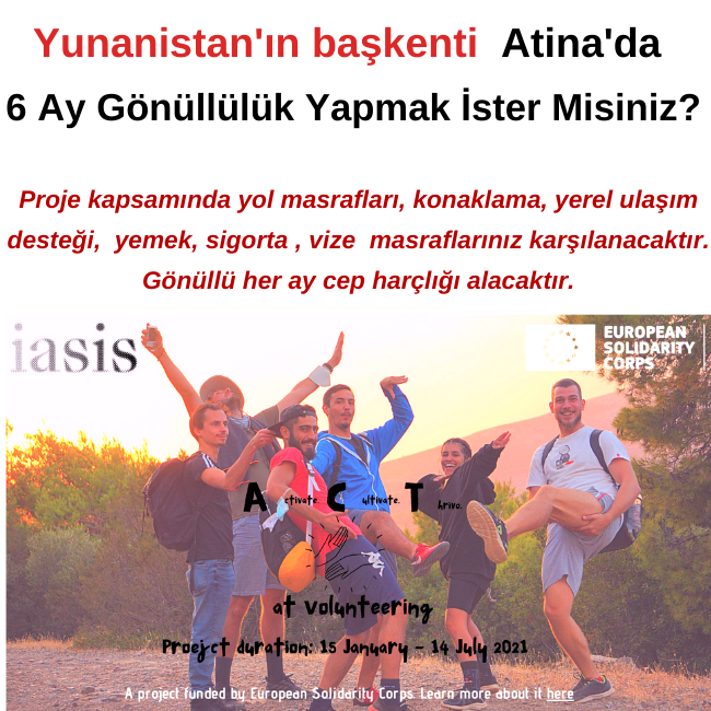 Proje kapsamında yol masrafları, konaklama, yerel ulaşım desteği, yemek, sigorta , vize masraflarınız karşılanacaktır. Gönüllü her ay cep harçlığı alacaktır. Gönüllü, proje boyunca Yunanca dil desteği alacaktır